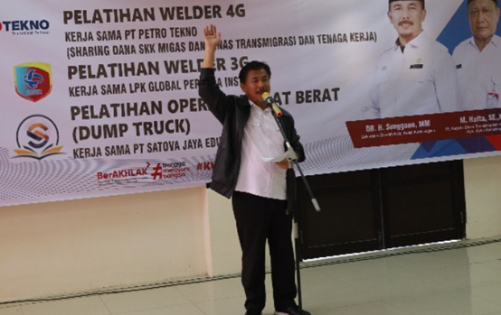 Dalam sambutannya, Sunggono menyampaikan rasa terima kasih kepada semua pihak yang telah berkontribusi dalam suksesnya pelatihan ini, termasuk SKK Migas dan PT Petro Tekno yang mendukung pelatihan Welder 4G, Polnes Samarinda yang berperan dalam pelatihan Welder 3G, serta PT Satova Jaya Education Center untuk pelatihan Operator Alat Berat. Sunggono menekankan bahwa pelatihan ini sangat penting untuk meningkatkan keterampilan tenaga kerja lokal agar mereka dapat lebih kompetitif di pasar kerja yang semakin menantang.