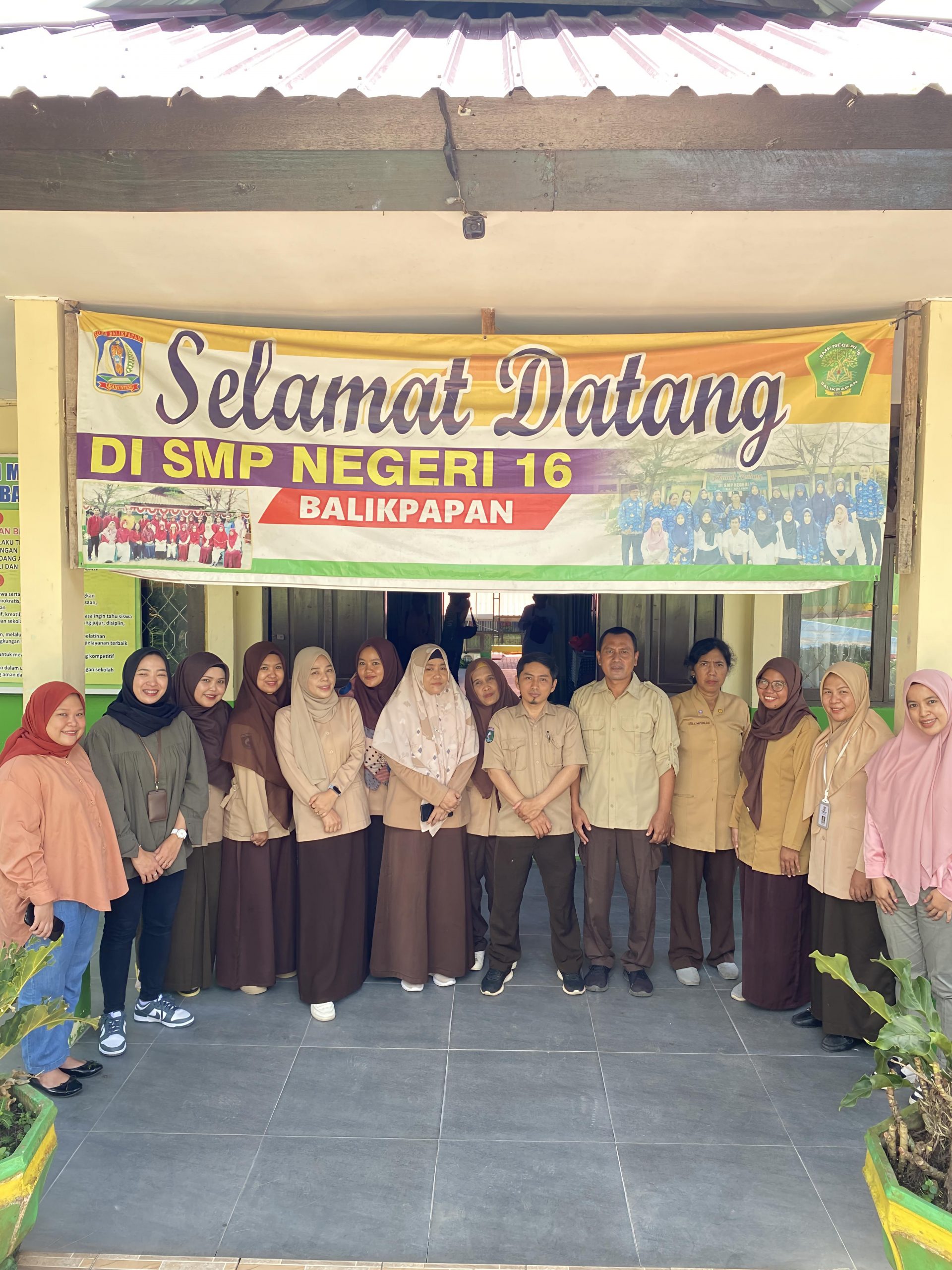 Caption Foto : Tim Indibiz mengabadikan momen bersama jajaran guru di SMP Negeri 16 Balikpapan saat melakukan kunjungan / HO Suarafajar