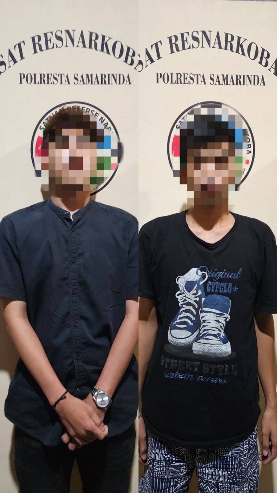 Caption Foto : Dua Pelaku berinisial RF dan YA ketika diamankan oleh jajaran Satresnarkoba Polresta Samarinda / Humas Polresta Samarinda
