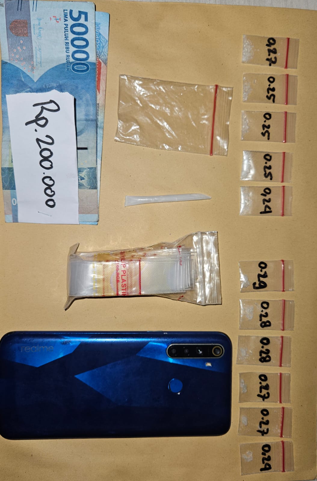 Tak hanya itu, penggeledahan di dalam kamar juga mengungkap enam poket tambahan dengan berat 1,63 gram yang disembunyikan di dalam lemari pakaian. Barang bukti lain yang disita di lokasi antara lain satu unit ponsel dan uang tunai sebesar Rp 200 ribu yang diduga hasil penjualan sabu.