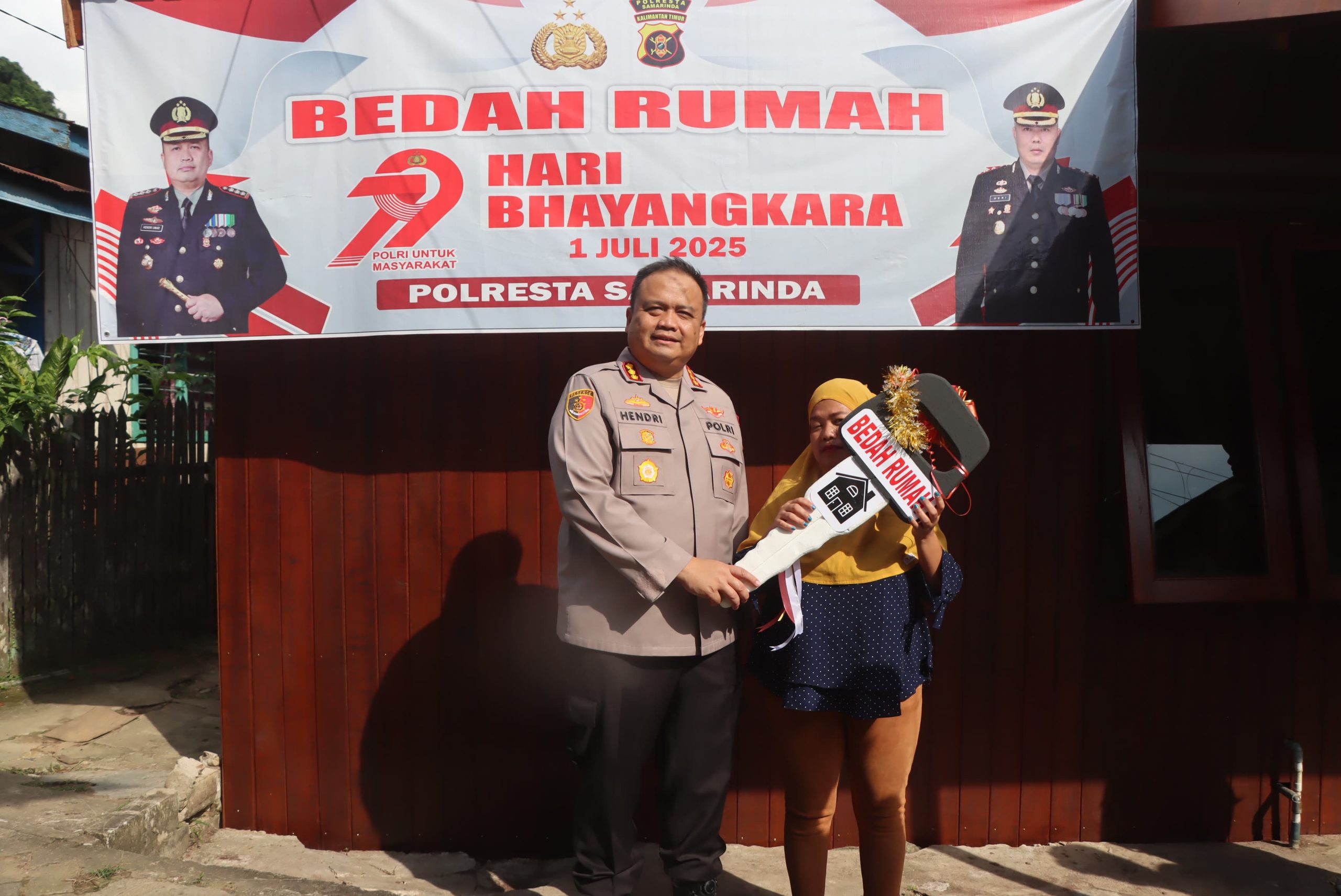 Caption Foto : Kapolresta Samarinda, Kombes Pol Hendri Umar, saat menyerahkan kunci secara simbolis kepada warga yang menerima program bedah rumah dalam rangka Hari Bhayangkara ke-79 / Humas Polresta Samarinda